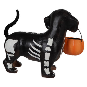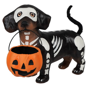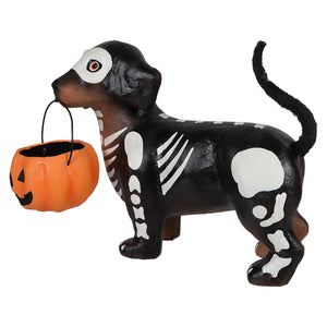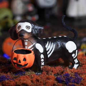 This little bonehead is on a mission — and he's not leaving without some serious treats! Skelly Pup may look like a doggone fright, but beneath that bony disguise is a determined dachshund ready to charm his way into your Halloween display. With his sleek black skeleton costume hugging his long body and a cheerful orange pumpkin bucket clutched in his mouth, this four-legged trick-or-treater is prepared to haunt the neighborhood in search of tasty treasures.