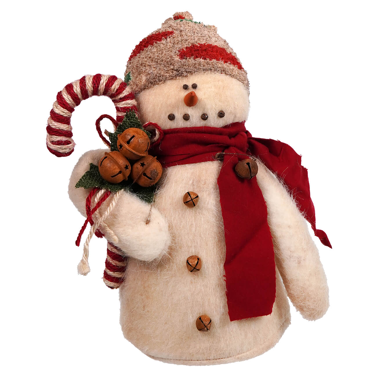 The Skicap Snowman Holding Candy Cane by Rags A. Muffin Junction brings triple the holiday cheer with three jolly snowmen dressed for a picture-perfect Christmas. One sports a dark green cap, another a red one, and the third a crisp white cap that looks like it’s been dusted with fresh snow. Each snowman features the classic coal eyes, carrot nose, and joyful grin of wintertime tradition, wrapped snugly in a red scarf to keep out that imaginary chill. In their mittened hands, they hold candy canes adorned with tiny golden bells—because even snowmen appreciate a little festive flair.
