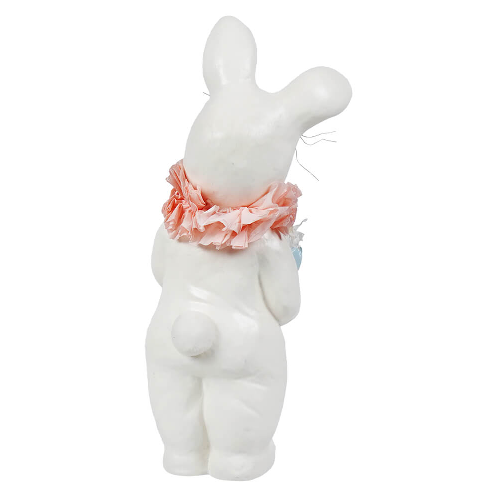 Our most favorite large Easter display figure from 2016 has now been made into a smaller figure! This precious little kid is all dressed up as the Easter Bunny, complete with bunny ears, a crepe collar and whiskers. Look closely and you'll see the best part of this piece, besides the yellow chick inside the blue Easter egg he is carrying, are those cute bunny slippers! Great for a grouping of Easter figures, or display this little guy surrounded by Easter grass and eggs!