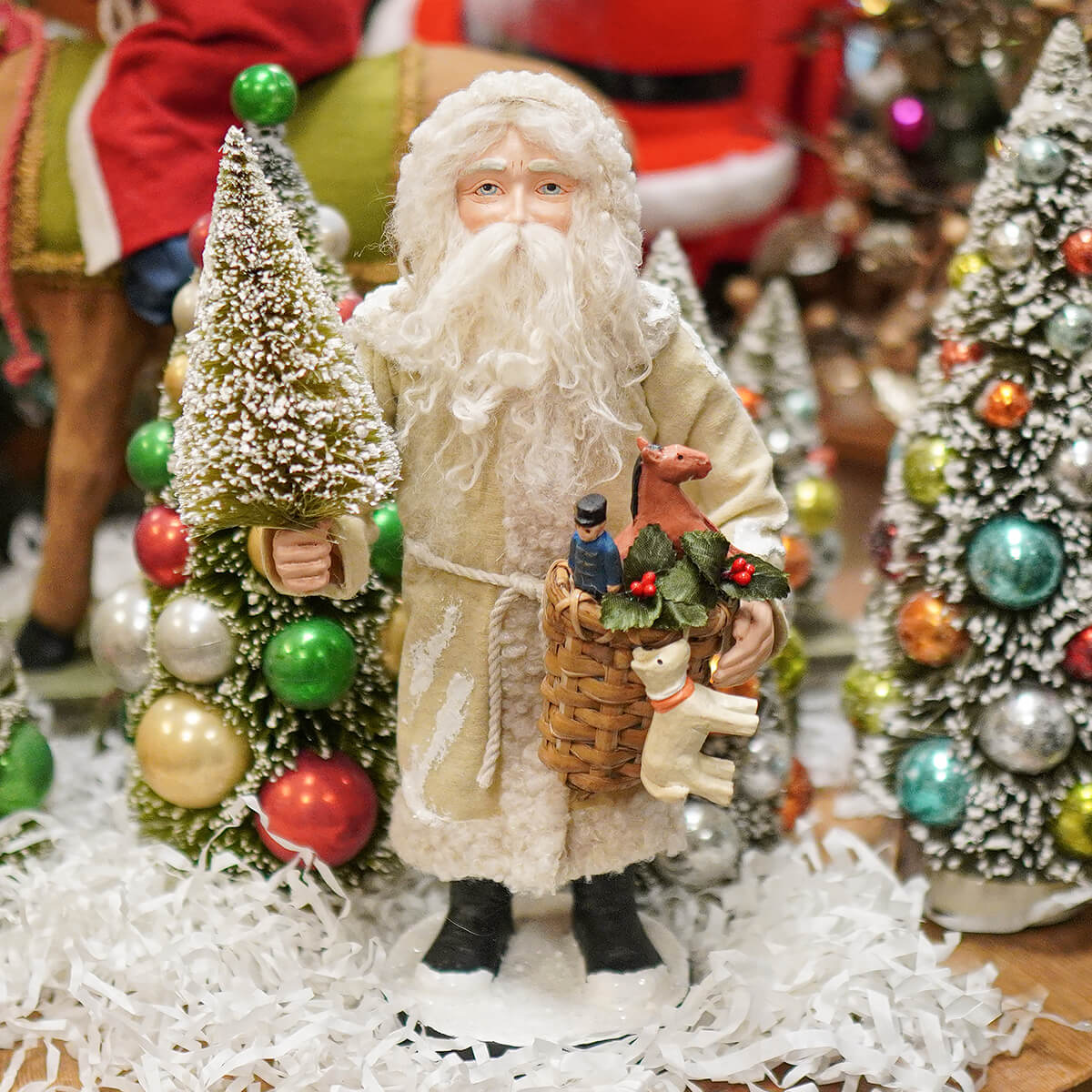 In one hand, Santa holds a wicker basket filled with toys, suggesting he’s midway through deliveries or carefully selecting the next gift to share. In the other, he carries a charming bottle brush tree, adding texture and a nod to vintage holiday styling. These thoughtful accessories give the figure depth and personality, making it feel like a miniature holiday scene all on its own.