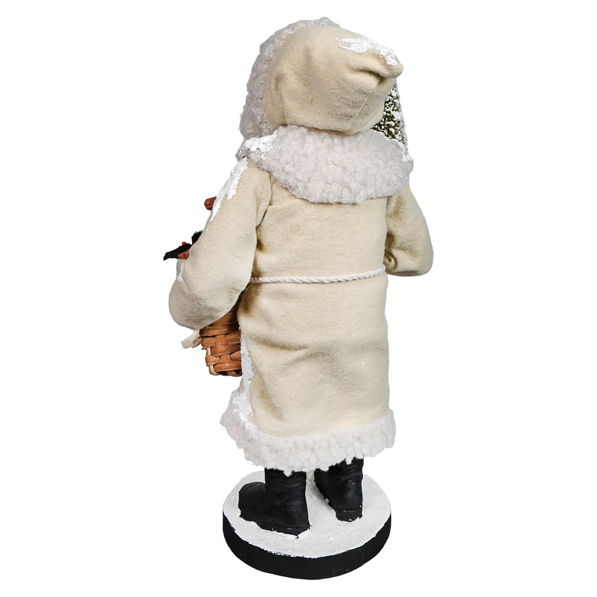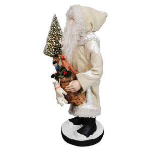 Small Santa With Toy Basket by Bethany Lowe Designs is a delightful holiday figure that captures the heart of Christmas in a compact, beautifully detailed form. Dressed in a soft white coat trimmed with cozy wool lining, this Santa offers a fresh twist on classic holiday attire while still feeling timeless and familiar. The light-colored coat gives him a gentle, wintery presence that pairs effortlessly with both traditional and neutral seasonal décor.