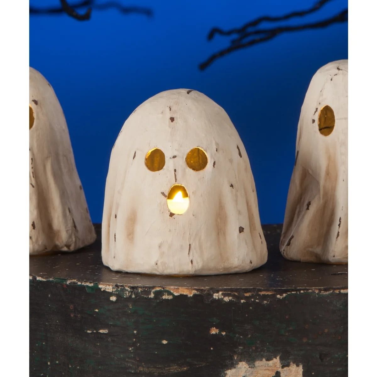 Whooooo dares to behold the Small Surprised Ghost Luminary? Gaze, mortals, for this spectral marvel will send chills down your spine! Crafted from delicate paper mache, this ethereal creation stands at a diminutive size of 2.5x2.5x3 inches, possessing a ghostly presence that transcends the realms of the living!