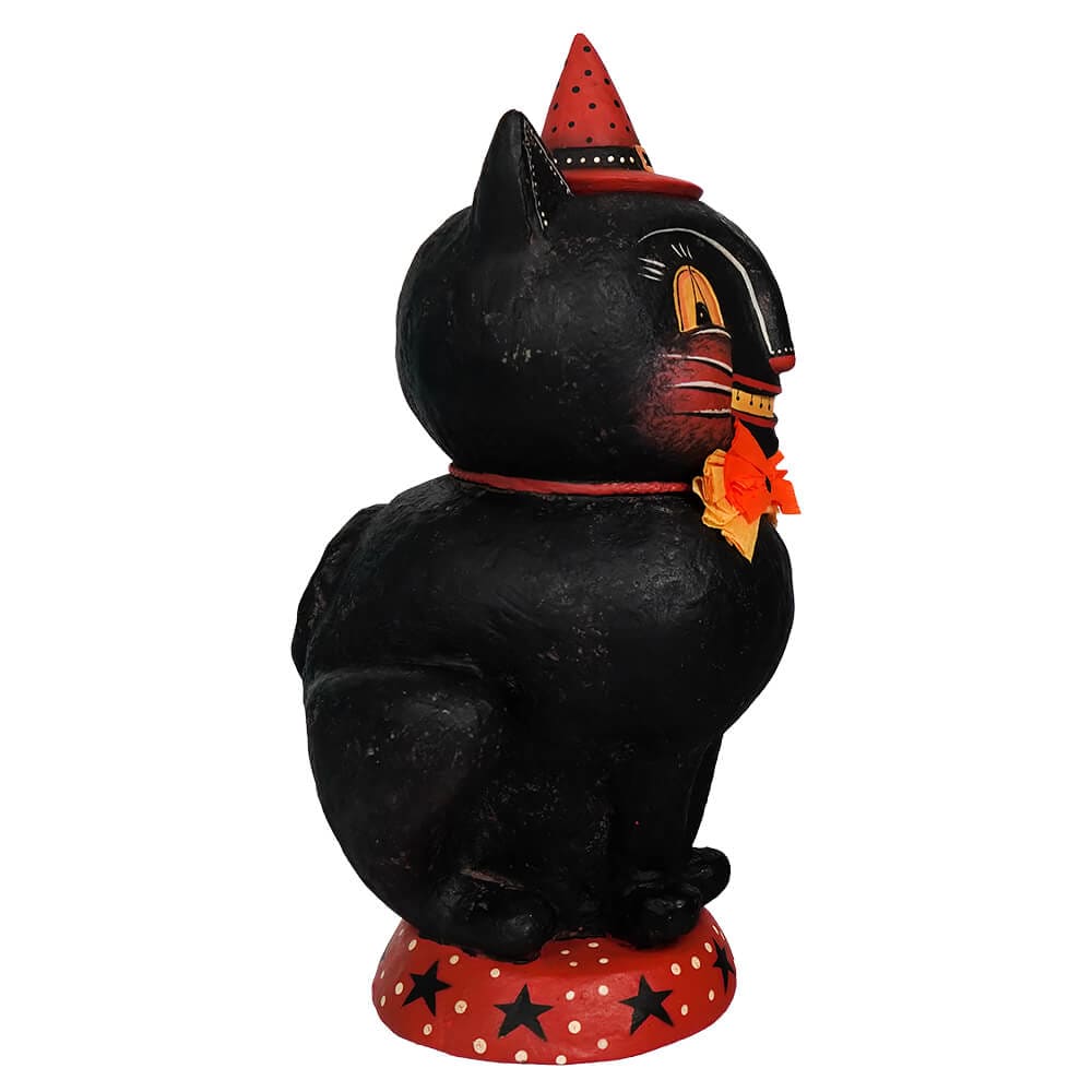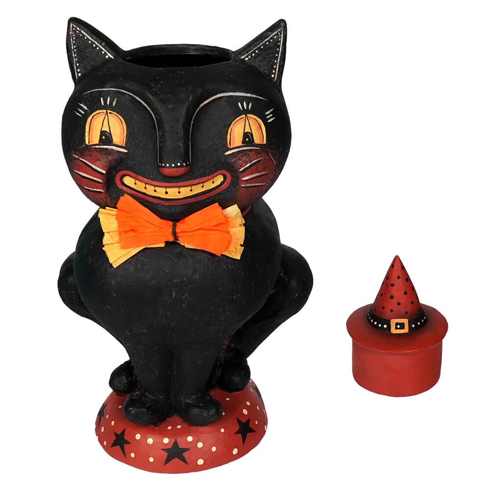 A Traditions exclusive!! Smilin' Simon Cat Container as a black cat has good reason to smile, he can be filled with candy! Not only is this smiling cat a fantastic, hand painted paper pulp decoration, but he is also a container. Lift off his hat as the lid to open it, and put some sweet treats inside.