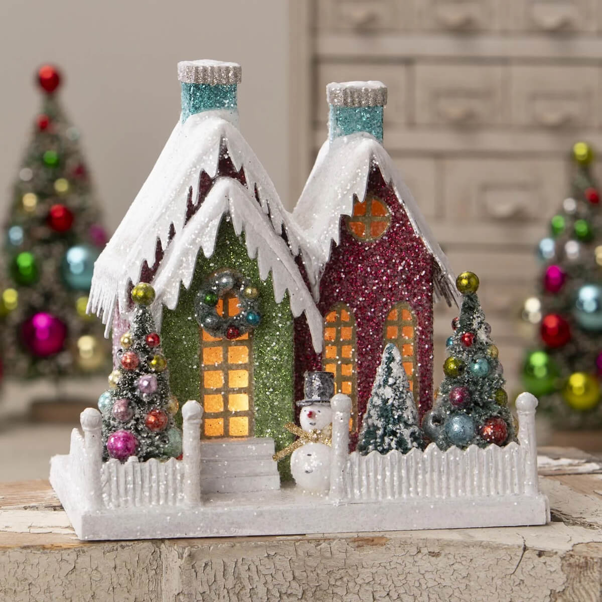 Welcome the sparkle of vintage Christmas kitsch into your holiday decor with the Snowman Kitschmas Cottage. This delightfully glittery pressed-paper house from Bethany Lowe bursts with color and character, offering a playful take on classic Christmas village houses. Standing 12.5 inches tall, it features a snowy roof, retro-inspired teal chimneys, and a welcoming front garden complete with a smiling snowman and colorful trees.