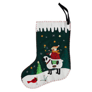 Saddle up for some holiday cheer with the Snowman on Sheep Stocking by New World! This festive wool felt stocking proves that when it comes to Christmas travel, a trusty sheep is just as good as a sleigh—at least according to the snowman riding along in his winter coat. Who knew Frosty had such an adventurous side?