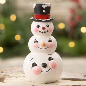 The Snowman Stack Candlestick by Bethany Lowe Designs is a charming tower of winter cheer, featuring three snowman heads stacked one on top of the other, each bringing its own dash of frosty personality. From their cheerful expressions to the perfectly balanced design, this piece feels like a playful take on classic holiday décor, all crowned with a crisp black top hat that adds just the right touch of timeless style. The stacked arrangement draws the eye upward, making it an instant focal point whether it’s placed on a mantel, dining table, or part of a festive centerpiece. At the top, the candlestick holder is ready to showcase your favorite taper, adding a warm glow that enhances every detail below. The contrast of the bright white snowmen against the dark hat and the soft flicker of candlelight creates a cozy, inviting atmosphere that feels right at home during the holiday season. Both decorative and functional, it blends classic Christmas character with a sense of humor that keeps it from feeling too formal. Perfect for collectors of Bethany Lowe Designs or anyone looking to add a little personality to their candle displays, this stacked trio proves that more really is merrier.