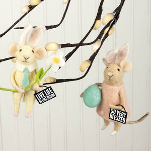 Even the Smallest creatures can remind use to "Live Life In Full Bloom," especially in the springtime! These two mice are living life to the fullest this Easter in their bunny ears, each so excited to bring their flower and blue egg to the Easter gathering of critters. The soft felted wool of these So Very Blessed Critter ornaments make them perfect additions to an Easter themed tree or even an Easter figure collection.