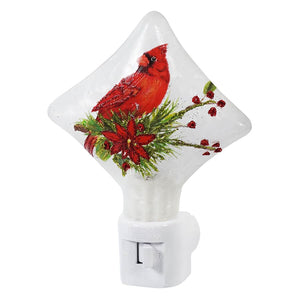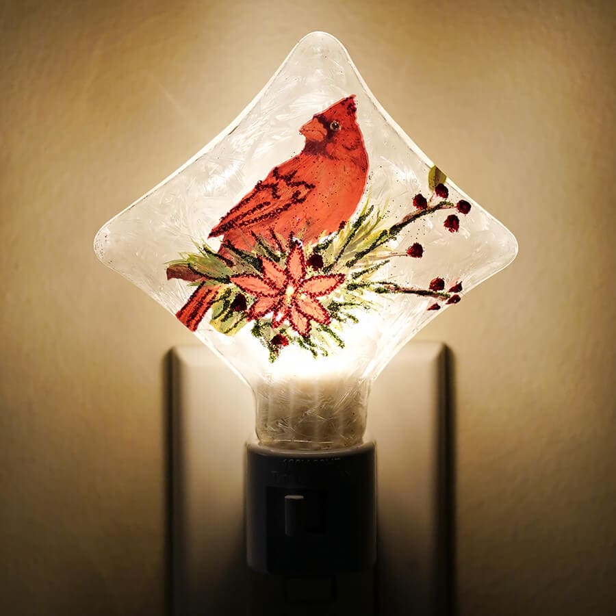 Featuring a vivid red cardinal perched on a holly branch, this night light captures the essence of holiday cheer. The addition of a poinsettia further enhances its seasonal charm, making it a delightful decoration for any room.