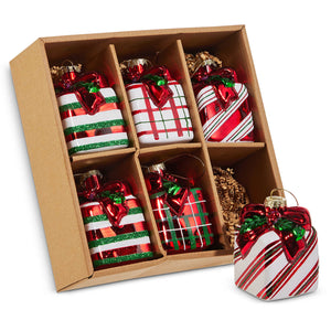 Bring the spirit of gift-giving straight to your tree with the Striped Plaid Gift Ornaments Box Set by RAZ Imports — six tiny presents that never need unwrapping. Each ornament is designed like a miniature Christmas gift, decked out in bright red, green, and white stripes and plaid patterns that feel straight out of Santa’s workshop. With a glossy finish and festive ribbons on top, these charming ornaments look ready to be slipped under a miniature tree or tucked among twinkling lights and candy canes.