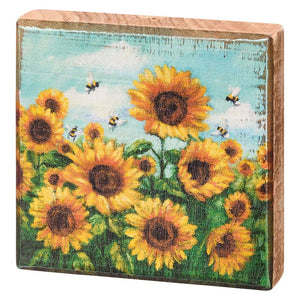 - A wooden block sign from Primatives By Kathy Garden Collection depicting a field of sunflowers.