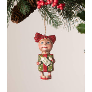 Dressed like a tiny wrapped present, she features a bright red bow, striped stockings, a green polka dot gift box, and a little “Merry X-Mas” tag. Her sweet smile and hand-painted details bring a playful, nostalgic look that fits beautifully on any Christmas tree.