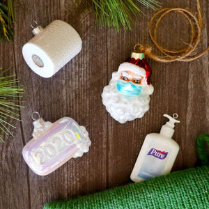 Hand sanitizer, check. Toilet paper, check. Soap and face mask, check and check. This set of 2020 Survival Kit ornaments collects the unexpected items that have become so prevalent in our lives during the Covid-19 pandemic. Santa practices good mask etiquette with his blue surgical mask on, but maybe he should consider doing the unthinkable and trim the beard. With the lathered up 2020 soap, "Pure" hand sanitizer and textured toilet paper roll, this set encourages good hygiene and good fun as a gag gift this holiday season.