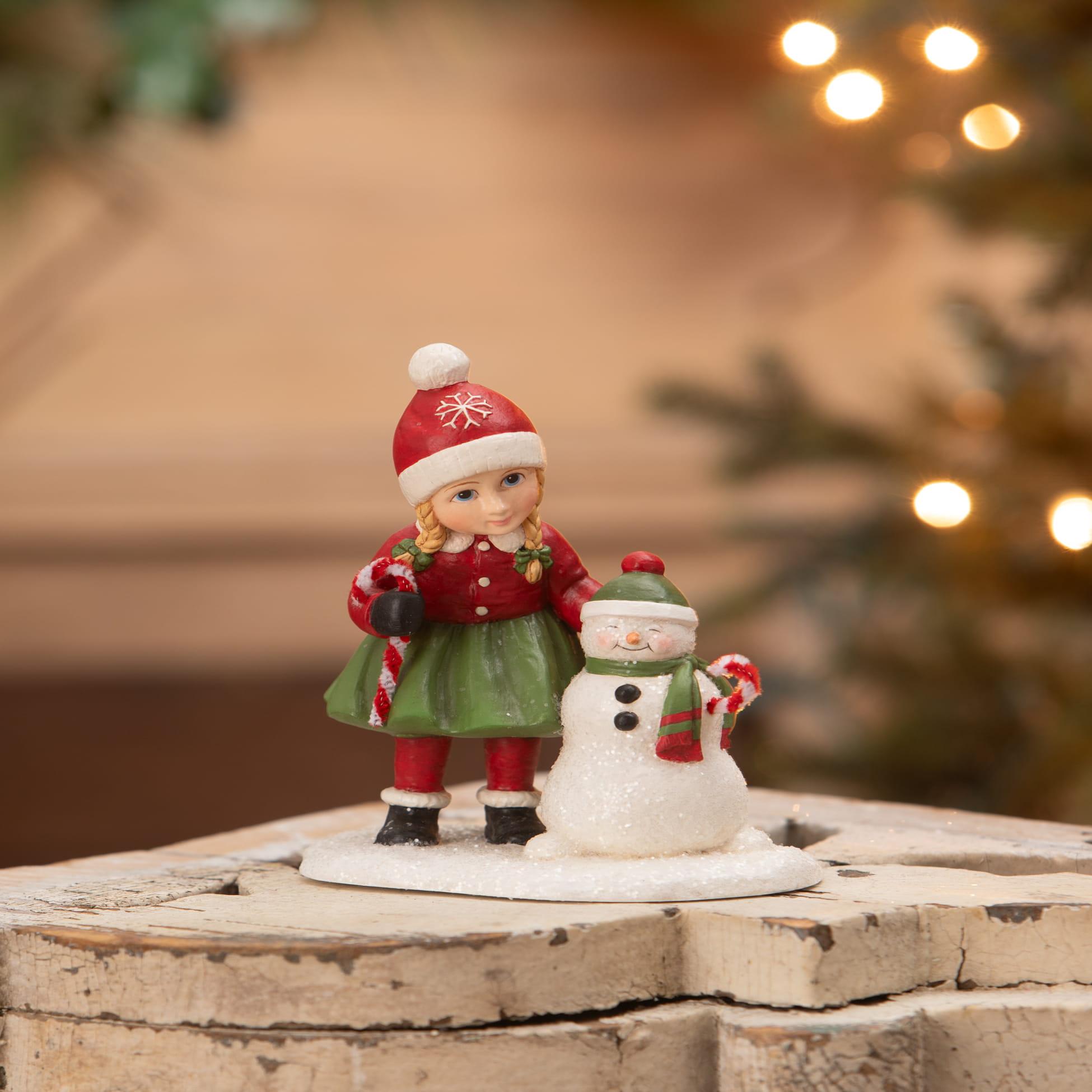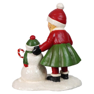 Susie With Snowman by Bethany Lowe Designs is a heartwarming holiday figure that captures the simple joy of a winter day spent with a favorite snowy friend. Susie is dressed in a cheerful red and green outfit, featuring a green skirt, red top, and coordinating leggings that feel perfectly suited for a brisk winter stroll. Her red beanie, decorated with a delicate snowflake, adds a cozy finishing touch, while the candy cane she holds brings in a classic seasonal detail.