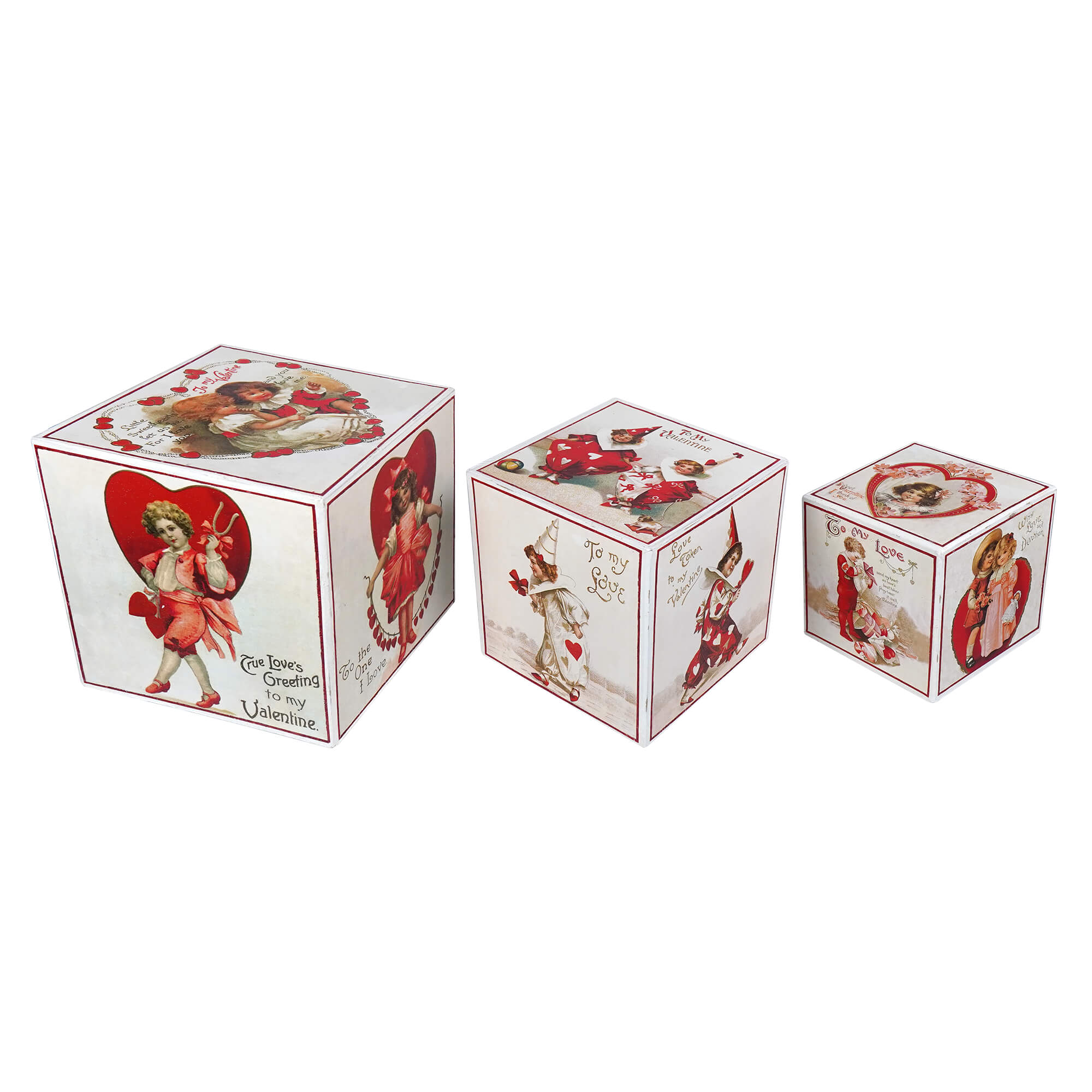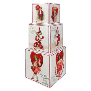 These blocks, standing at 6, 4, and 3 inches tall, are the building blocks of a romantic tableau. With the ability to stack them high or spread them out, you can create a display that tells a story of Valentine's Day from days gone by. On each side, the illustrations come to life, showing children dressed in their Valentine's best, from formal attire to playful clown costumes, each scene a snapshot of innocent celebration.
