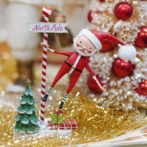 This charming tabletop figure by Lori Mitchell captures the playful magic of Christmas in a way that’s both classic and unexpected. Perfect for mantels, shelves, or anywhere that could use a little North Pole energy, it’s a delightful reminder that even Santa knows how to let loose and enjoy the festivities.