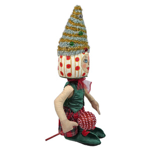The Tabitha Tree Standing Doll by Joe Spencer looks delightfully ready to host a holiday party the moment she arrives—mostly because she’s already dressed as both the guest and the décor. Her head is surrounded by a charming white base sprinkled with red polka dots, the kind of festive pattern that practically shouts “Christmastime!” before she even says a word. From that base rises a tall grey-blue tree, trimmed with gold tinsel and ornaments that sparkle just enough to let you know Tabitha takes her role as a walking holiday centerpiece very seriously. She’s equal parts tree topper, ornament, and cheerful Christmas character, wrapped into one delightfully quirky figure.