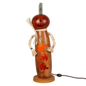 Glowing warmly through the autumn evening, the ""Tall Dexter Boy Large Lit Gourd"" is a beacon of the harvest season. This unique 21-inch tall decoration is a fusion of natural artistry and festive ingenuity, crafted from a gourd grown on American soil and fashioned by the skilled artisans at Meadowbrooke Gourds.