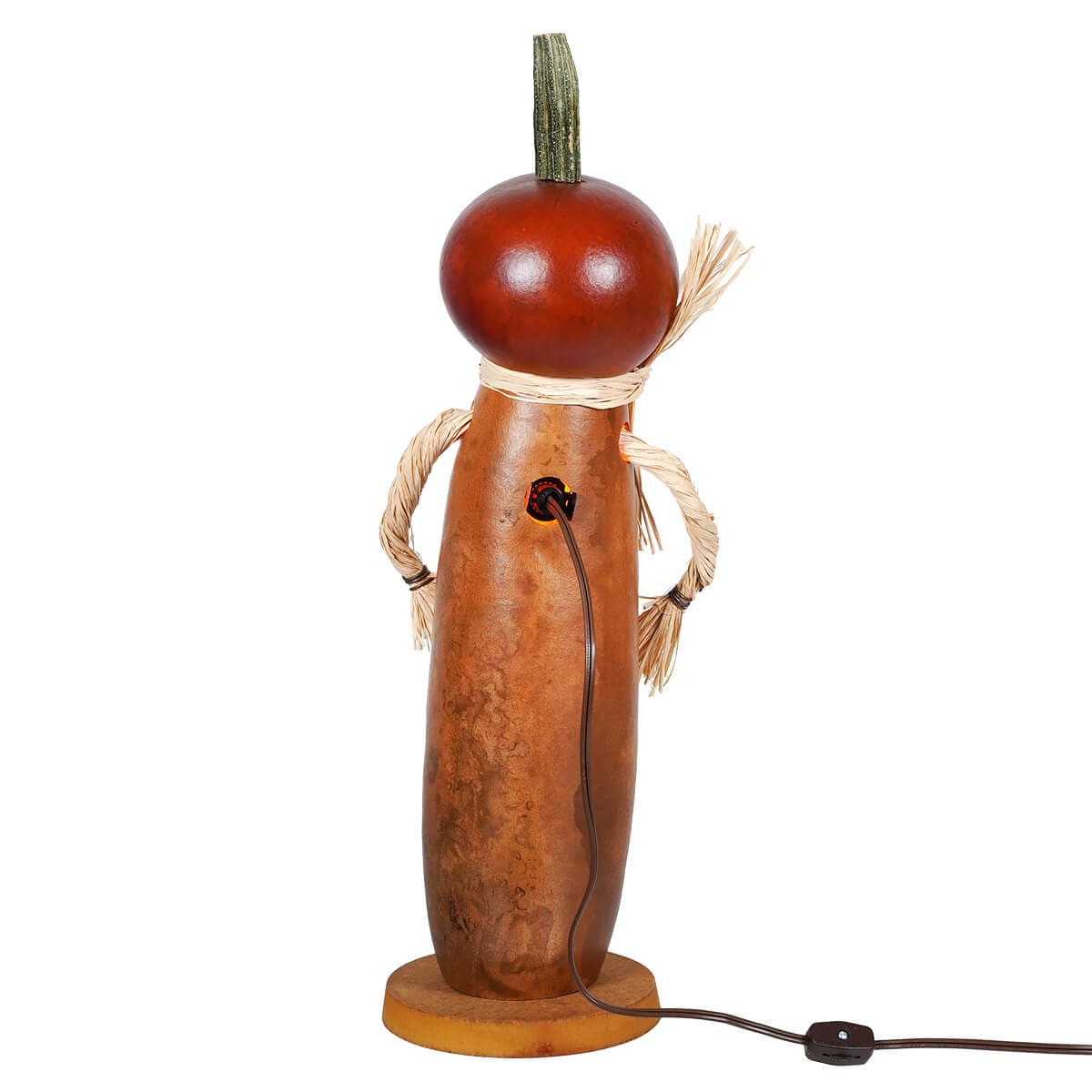 With a body shaped from a carefully selected gourd, complemented by arms of twisted raffia that add a rustic feel. The gourd's exterior, with its rich, warm tones, is adorned with playful cut-outs, which, when illuminated, cast dancing shadows and create an inviting glow.