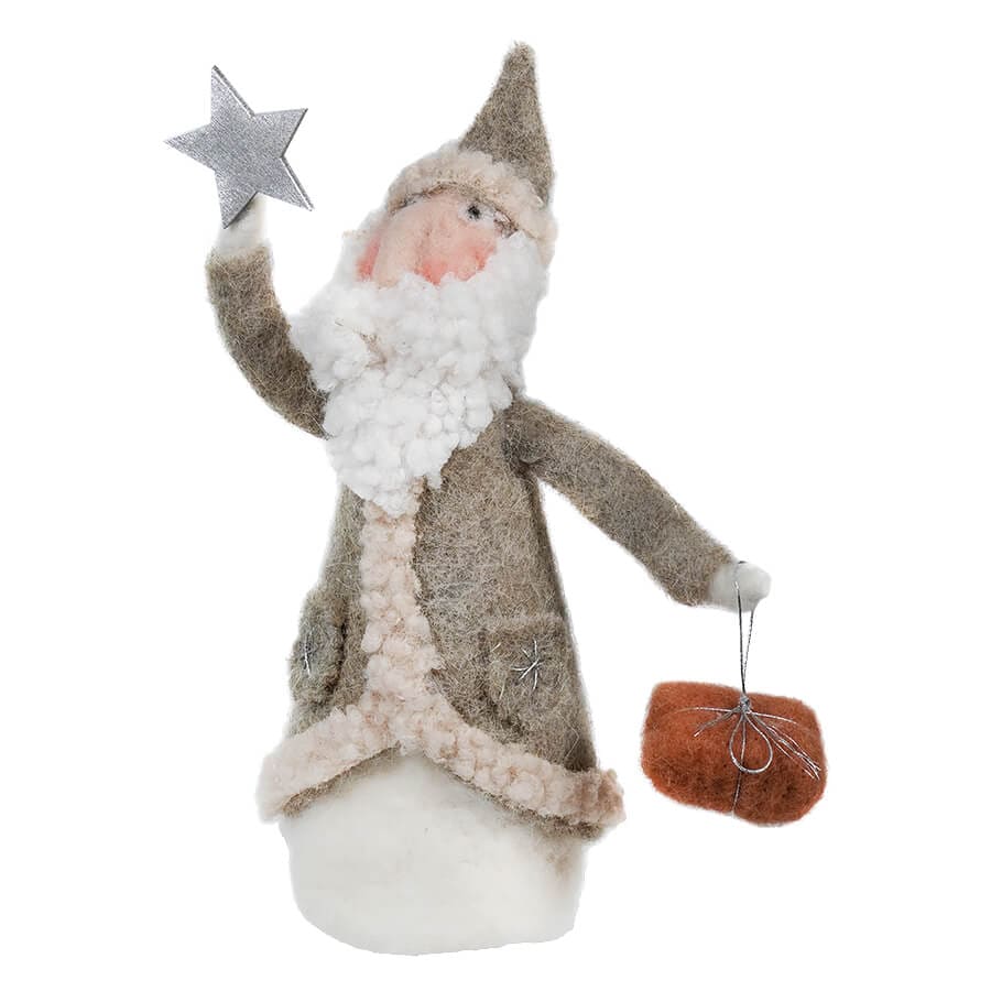 As a piece of folk art, this delightful Tan Wool Felt Santa with Embroidery is a perfect addition to your Santa collection. Standing at 9 inches tall, this wooly Santa Claus figure is the embodiment of holiday cheer. Crafted from soft wool felt, this figure is as comfy as a winter's night by the fireplace.