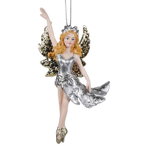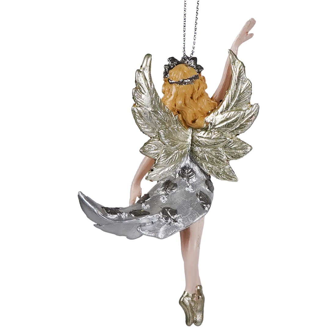 Stretching out behind her are two glistening wings, each flecked with silver and gold. Her calm figure is given a fanciful touch by the wings, which makes her a remarkable addition to any holiday collection.