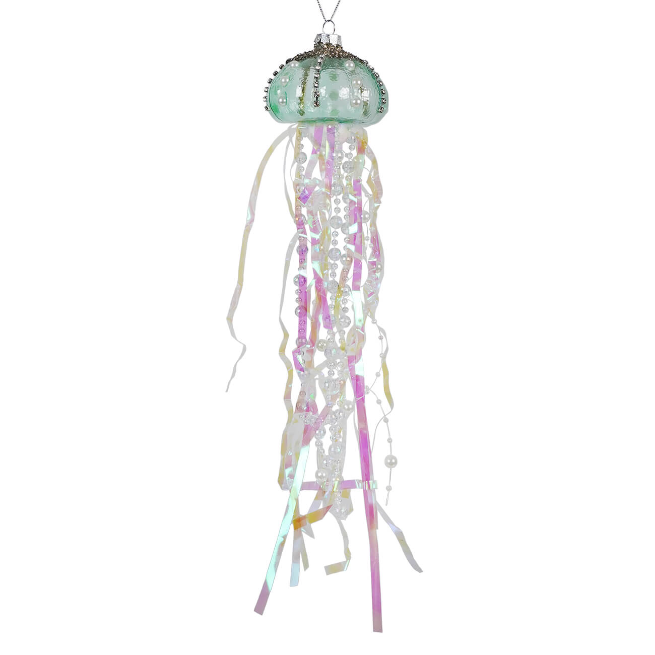 The teal dome on top of the ornament is embellished with glitter and rhinestones that resemble the ghostly form of a jellyfish immersed in deep water. A beautiful waterfall of beads and colorful ribbons, symbolizing the jellyfish's long, graceful tentacles, cascades down from this glittering hat. A captivating display of colors and motions is produced by these tentacles' ability to capture and reflect light, simulating a jellyfish's soft sway over the calm water.