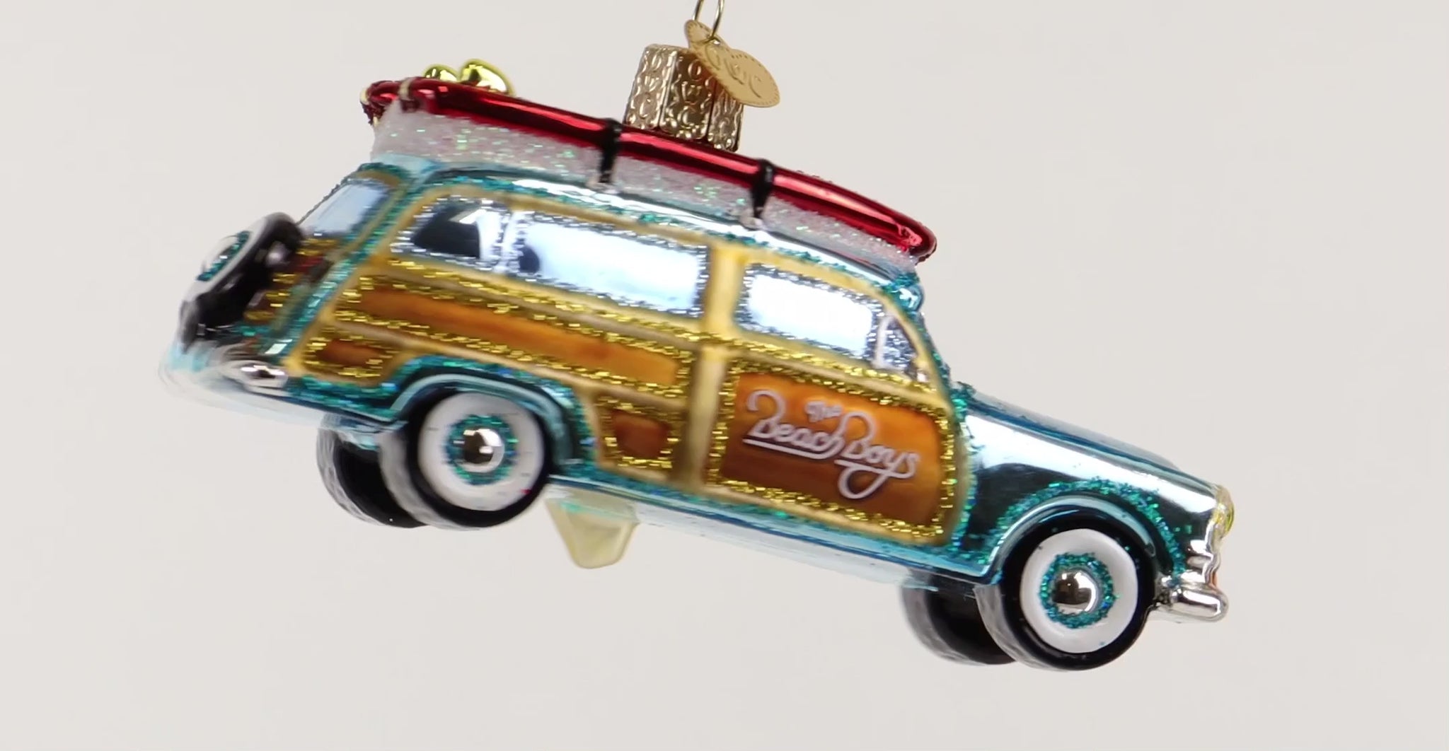 The Beach Boys Surfin’ Woody ornament by Old World Christmas captures that carefree, coastal spirit with a vintage woodie wagon packed and ready for the beach. Finished in bright turquoise and warm wood tones, the car is topped with a red surfboard and detailed with playful touches like “Catch a Wave” and The Beach Boys logo along the side. It feels like a snapshot of endless summer, full of music, sunshine, and salt air.
