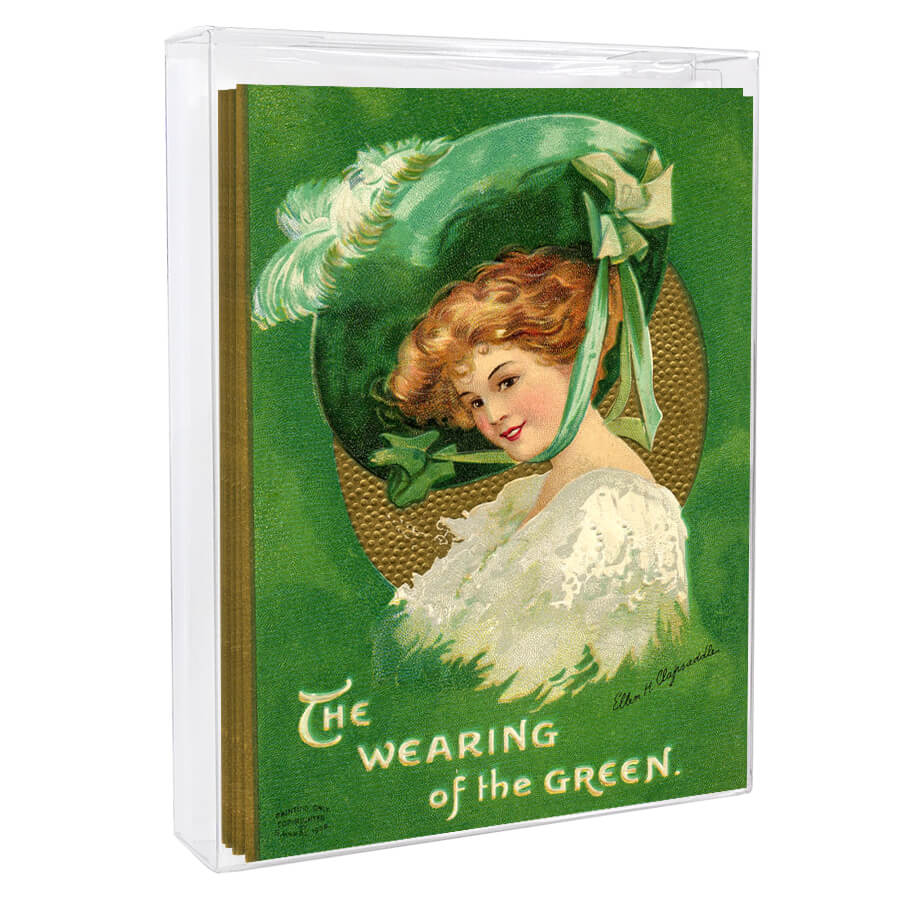 Get into the spirit of St. Patrick’s Day with a greeting card that captures the classic elegance of "The Wearing of the Green." Featuring a vintage design of a smiling woman adorned in a rich emerald hat with delicate lace accents, this card evokes a timeless charm that’s perfect for celebrating the Irish holiday. Whether you’re sending well-wishes or simply spreading some cheer, this card is a delightful way to share the joy of the season.