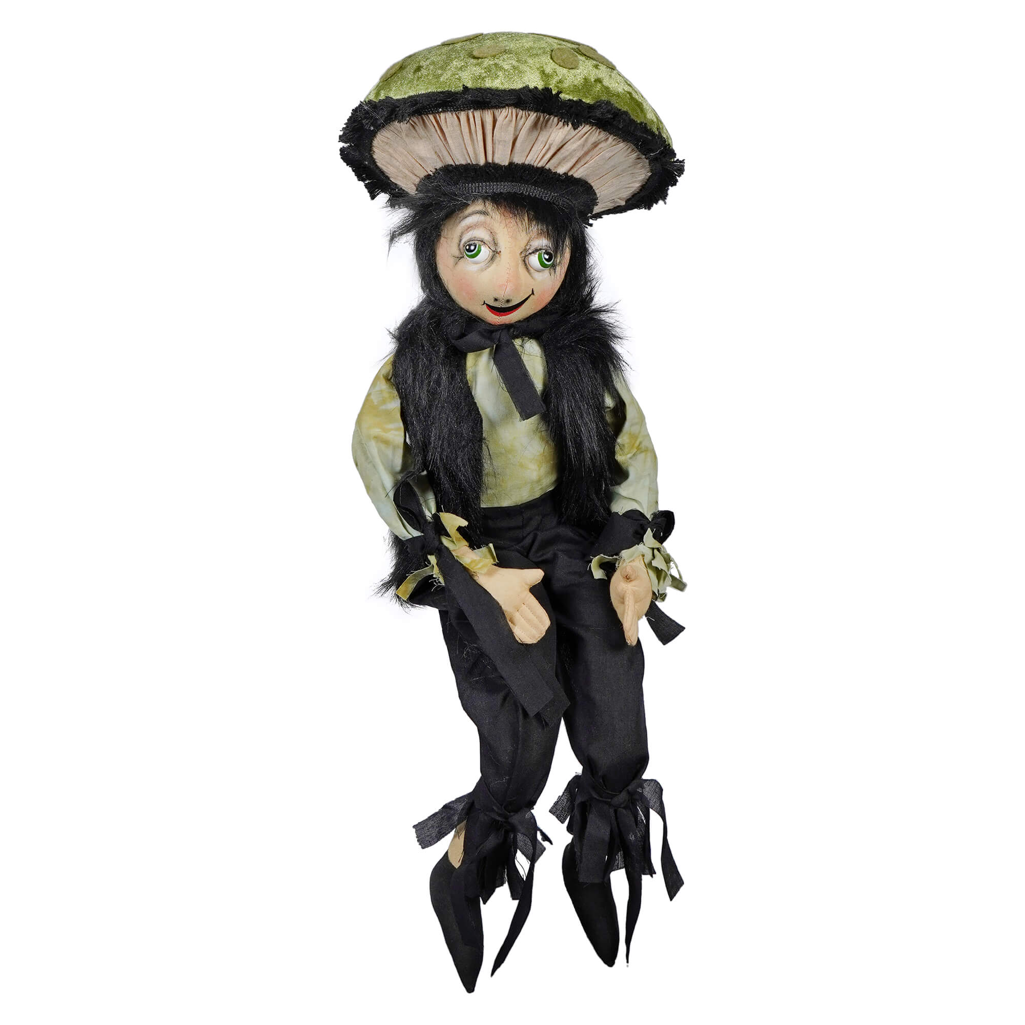 Tommy's mushroom cap is made with beautiful craftsmanship is a soft green with gills that resembles the textured bottom of a mushroom. Wild black hair sprawls out across his face, contrasting sharply with his pale, beautifully painted features and emphasizing his large, bright eyes.