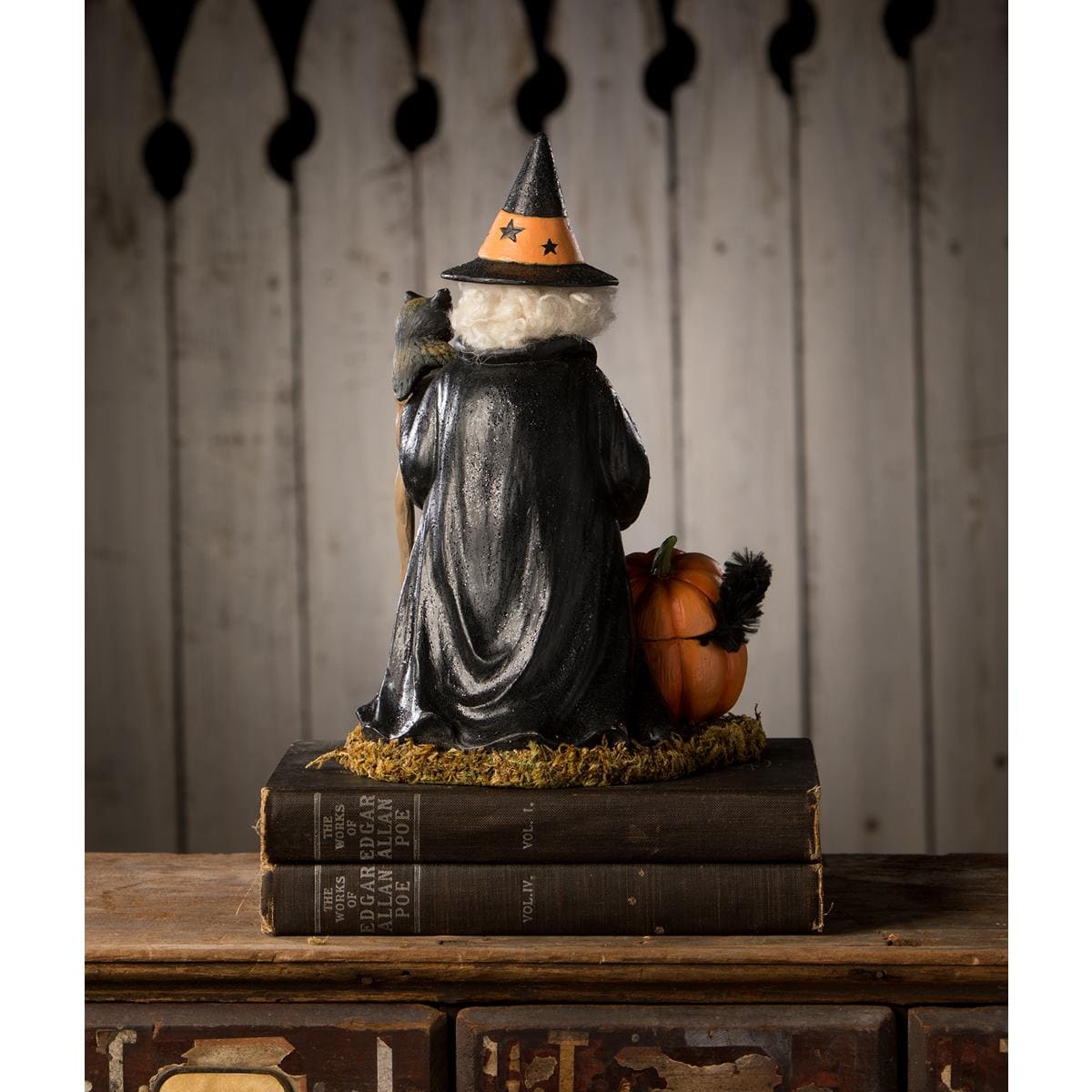 Cast a spell of charm and mischief with Trick or Treat Callie Witch by Bethany Lowe Designs – the enchantress who knows that every day is Halloween! Dressed in a black cloak over a bewitchingly green robe, Callie is not your ordinary spellcaster; she's a master of the magical and the mischievous.