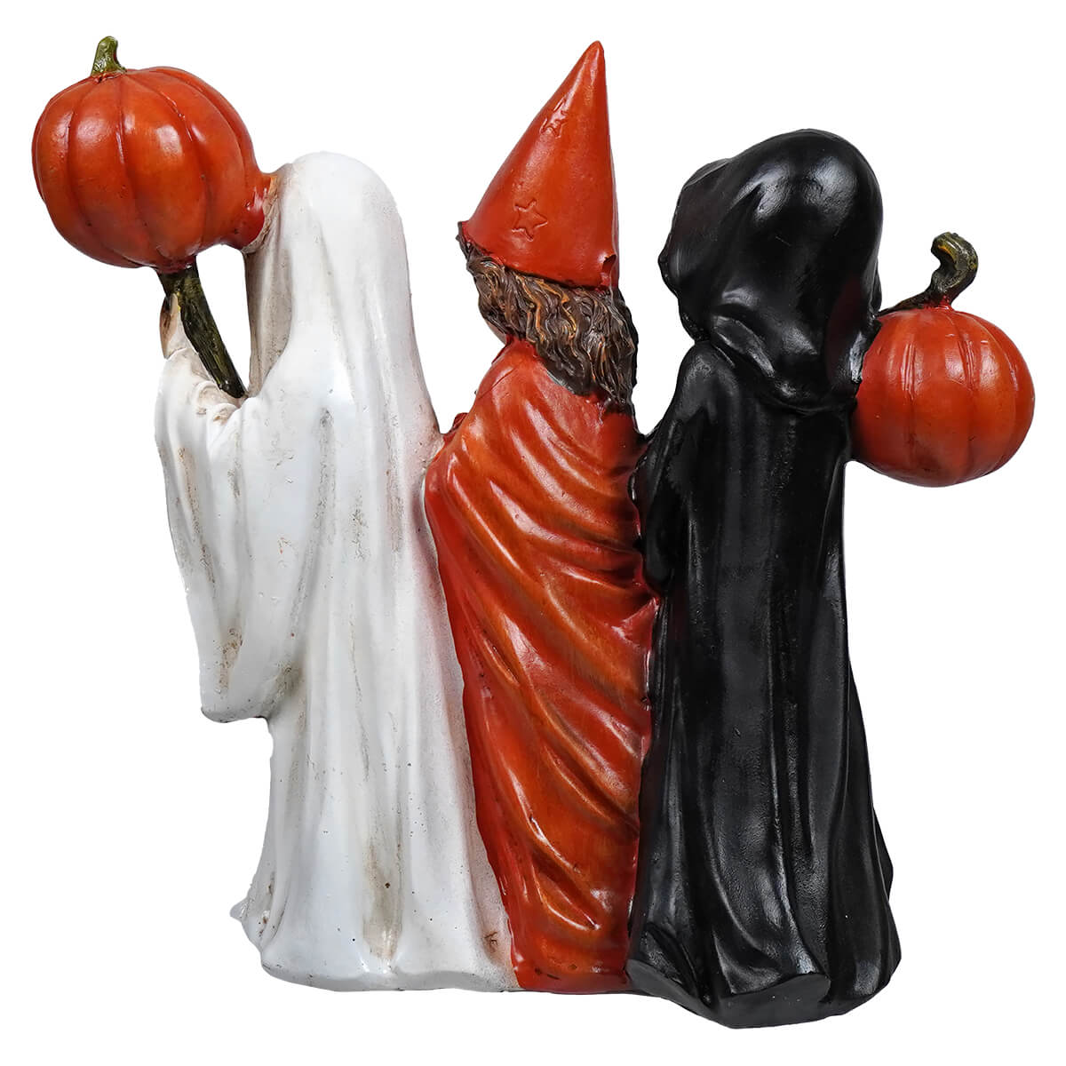 Crafted with careful attention to detail, this resin figure displays a charming blend of expressions and textures. The folds of the ghost costume, the intricate carving of the jack-o'-lanterns, and the playful pose of the cat all contribute to the figure's lively and engaging presence. The size of the piece makes it a perfect fit for a tabletop, mantel, or entryway, where it can greet guests and set the tone for the season.