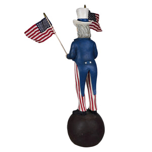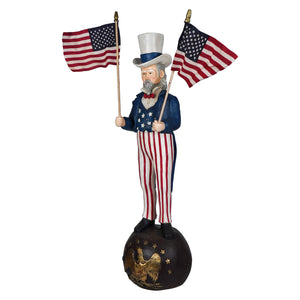Uncle Sam On Eagle Ball is a striking and patriotic addition to any Americana collection. Standing at an impressive size of 26" inches, this figurine shows the essence of American pride and patriotism.