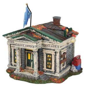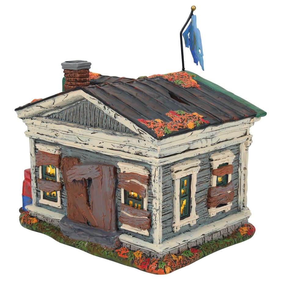 If you like abandoned buildings and structures, this Halloween village house is just right for you. The Village Ghost Office by Department 56 is created from hand painted resin and lighting. It has a dilapidated facade with dry leaves everywhere. The white paint is peeling on the building and the flagpole needs to be replaced with a new blue flag. The side and back windows, with the back door, are all boarded up with pieces of dark brown wood. There are even a few holes in the roof. Be careful when you put mail in the red and blue mailbox, you might feel like you’re being watched. The Village Ghost Office by Department 56 is a Halloween Village Accessory, make sure to pair the Hand Delivered Mail accessory as well! If you are a collector of the series, this new addition will fill in the gap your village has been missing!