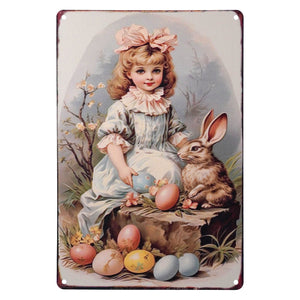 Vintage Smartly Dressed Girl With Easter Eggs & Bunny Metal Sign