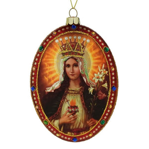 Gaze upon the front of this ornament and behold the serene visage of the Virgin Mary, crowned with glittering splendor fit for the queen of heavens. With delicate white flowers in one hand and the sacred heart in the other, it’s a poignant portrayal of faith, grace, and love that transcends time.