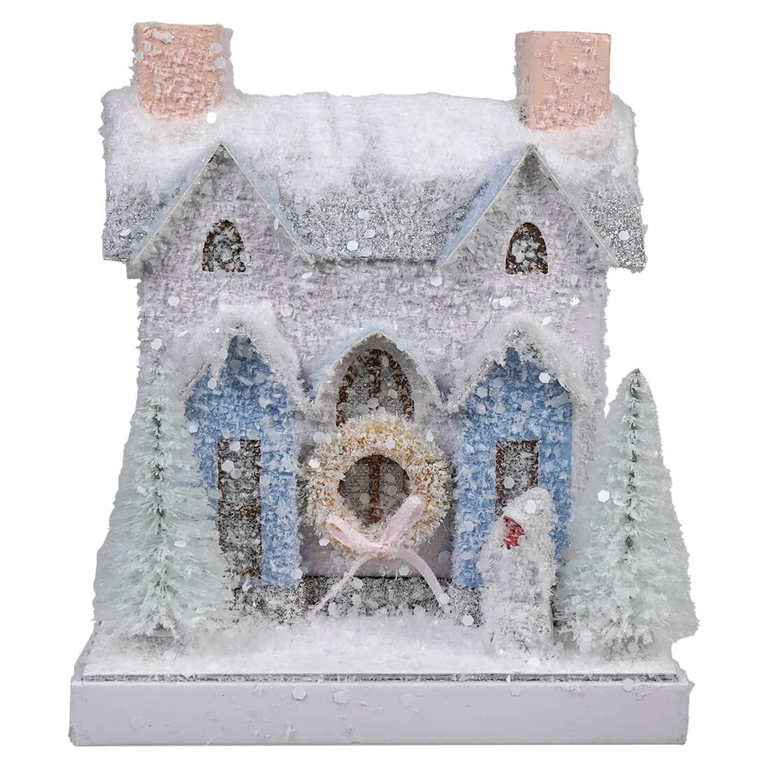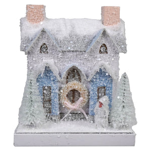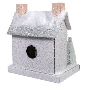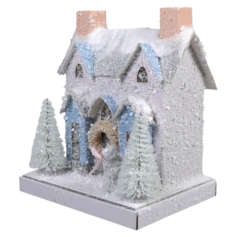 Each element of the villa, from the frosty pine trees standing guard at the sides to the ornate architectural detailing, contributes to its overall allure. A hole in the back allows for the insertion of a C7 light cord (sold separately), filling the home with a warm glow that beautifully highlights the cut-out windows.