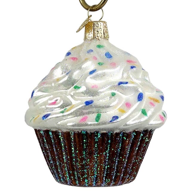 From Old World Christmas. Brighten any special occasion with this beautiful glass cupcake ornament which was carefully mouth-blown into a finely crafted mold. A hot solution of liquid silver was poured inside, and finally, it was hand-painted and glittered for you to enjoy and cherish as a holiday heirloom! A fine coat of iridescent glitter covers the wrapper and the pearly white frosting, which really looks like it was piped on and then sprinkled with rainbow sprinkles.