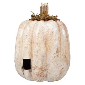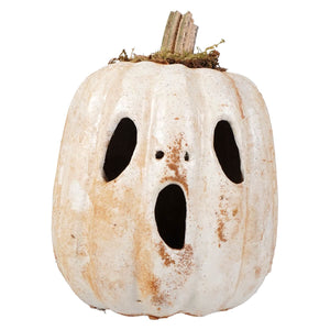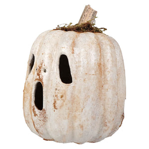 Standing at approxiamtely 6x6x8 inches, each pumpkin features varying lengths of stems, ensuring that no two are exactly alike. The spooky face carved into the pumpkin adds to its ghostly charm, making it a standout piece for your Halloween collection. The organic, slightly imperfect finish and earthy tones add a vintage feel that’s perfect for creating an eerie ambiance.