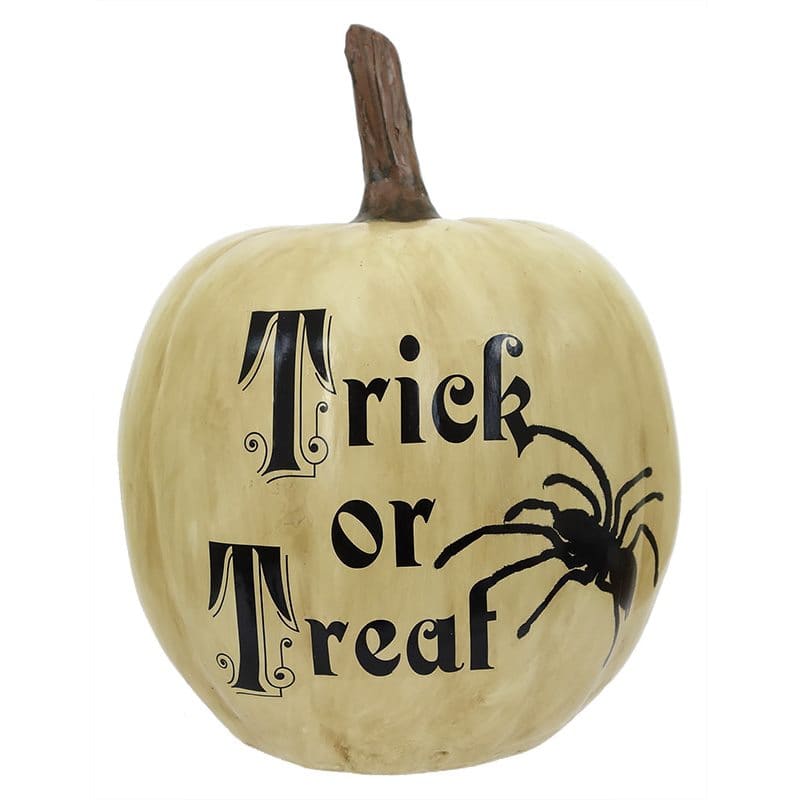 Welcome in the spooky season with this playful white pumpkin! It features a happy Trick or Treat greeting and is sure to get your guests in the All Hallows Eve spirit. And adding an extra bit of creepiness, a black spider expertly crawls across this festive gourd. It's a perfect way to greet Trick or Treaters at your front door or as a centerpiece for your own Halloween party! Adorn any spot in your home with this spirited pumpkin and you'll be sure to give all visitors a little sneak peek into what will surely be a spook-tacular Halloween!