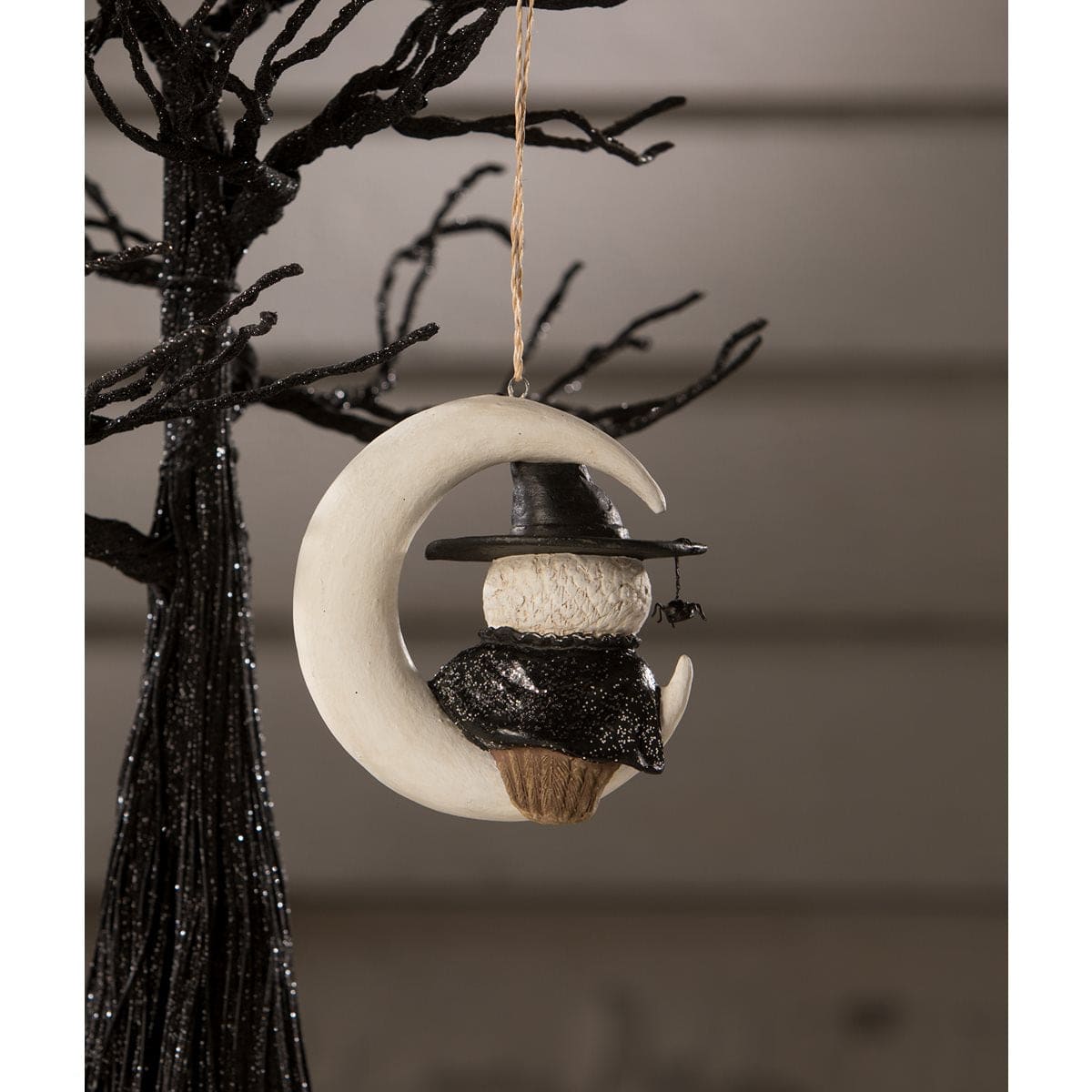 Behold the endearing Witch Owl On Moon Ornament, a captivating addition to your collection of magical Halloween treasures to hang on your tree or a mantel garland.