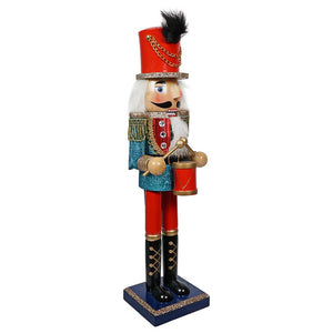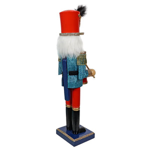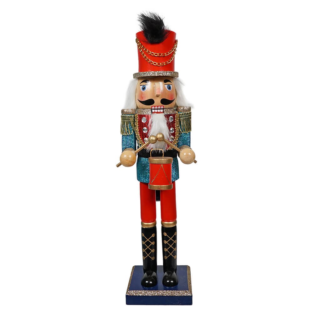 Standing tall at 16 inches, this nutcracker is a true showstopper. His aqua blue coat is covered in glitter that gives it a textured, sequin-like appearance, making him the center of attention in any holiday display. At his waist, you'll find a miniature drum, ready to add a musical touch to your decor.